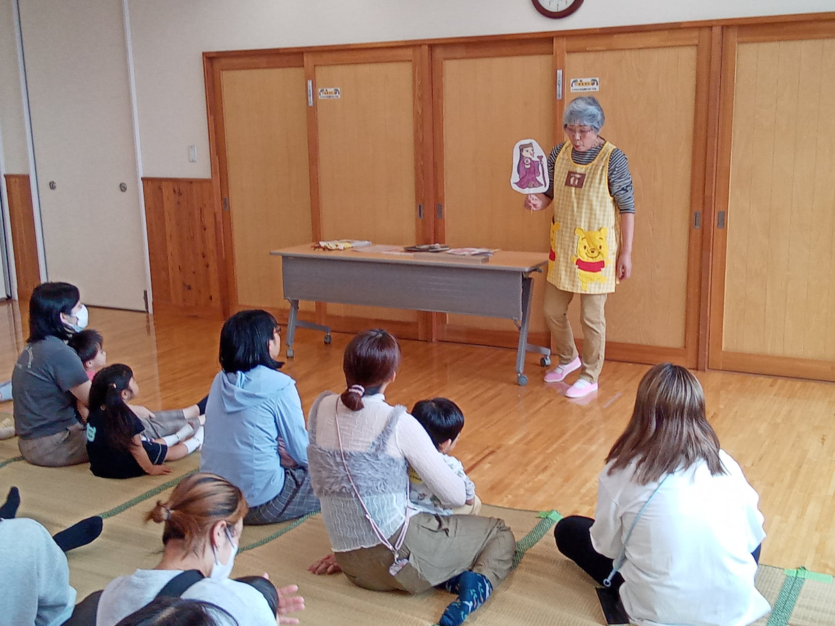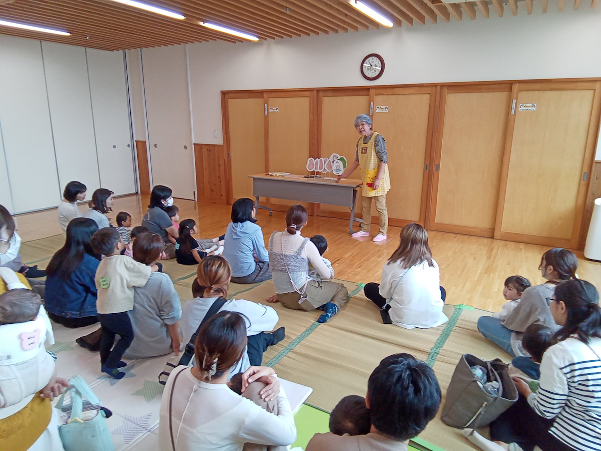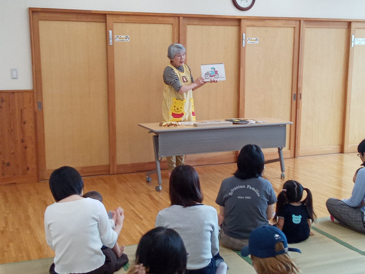 絵本だけでなく、季節に合わせたエプロンシアターやパネルシアター、手袋シアター、ペープサートなどたくさんのお話を見せてもらえます。なんと福田先生の手作りやオリジナルのものもあるので、職員も毎月楽しみにしています♪