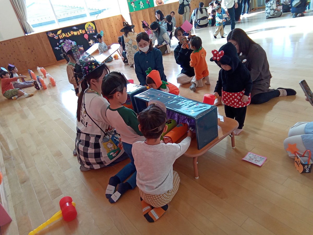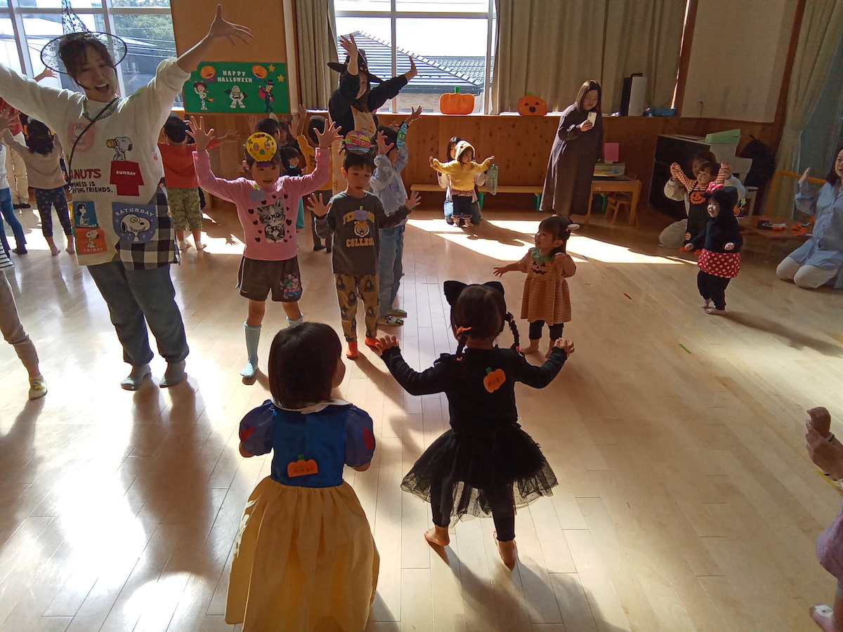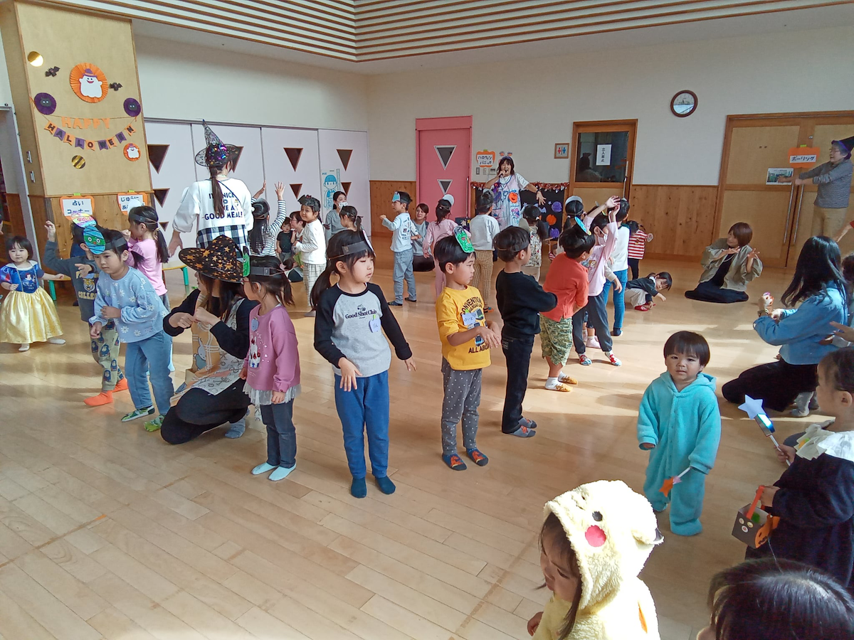 お知らせ レインボーキッズ ハロウィン 2025年10月24日 by ksdtadmin 保育所のホールで『ハロウィンパーティー』を行いました。保育所の一番大きな学年のぞう組さんがお手伝いに来てくれました。スタンプラリーでは、ぞう組さんがゲームの説明や仕掛け、また、優しく声を掛けてスタンプを押してくれました。スタンプラリーの他にもフォトコーナーがあり、思い出の1枚を撮っていました。最後は、ボランティアさん、ぞう組さん、レインボーキッズのみんなが仲良くなれるように大玉キャンディ送りと♪グーチョキパーでパンプキンのダンスで盛り上がりました。