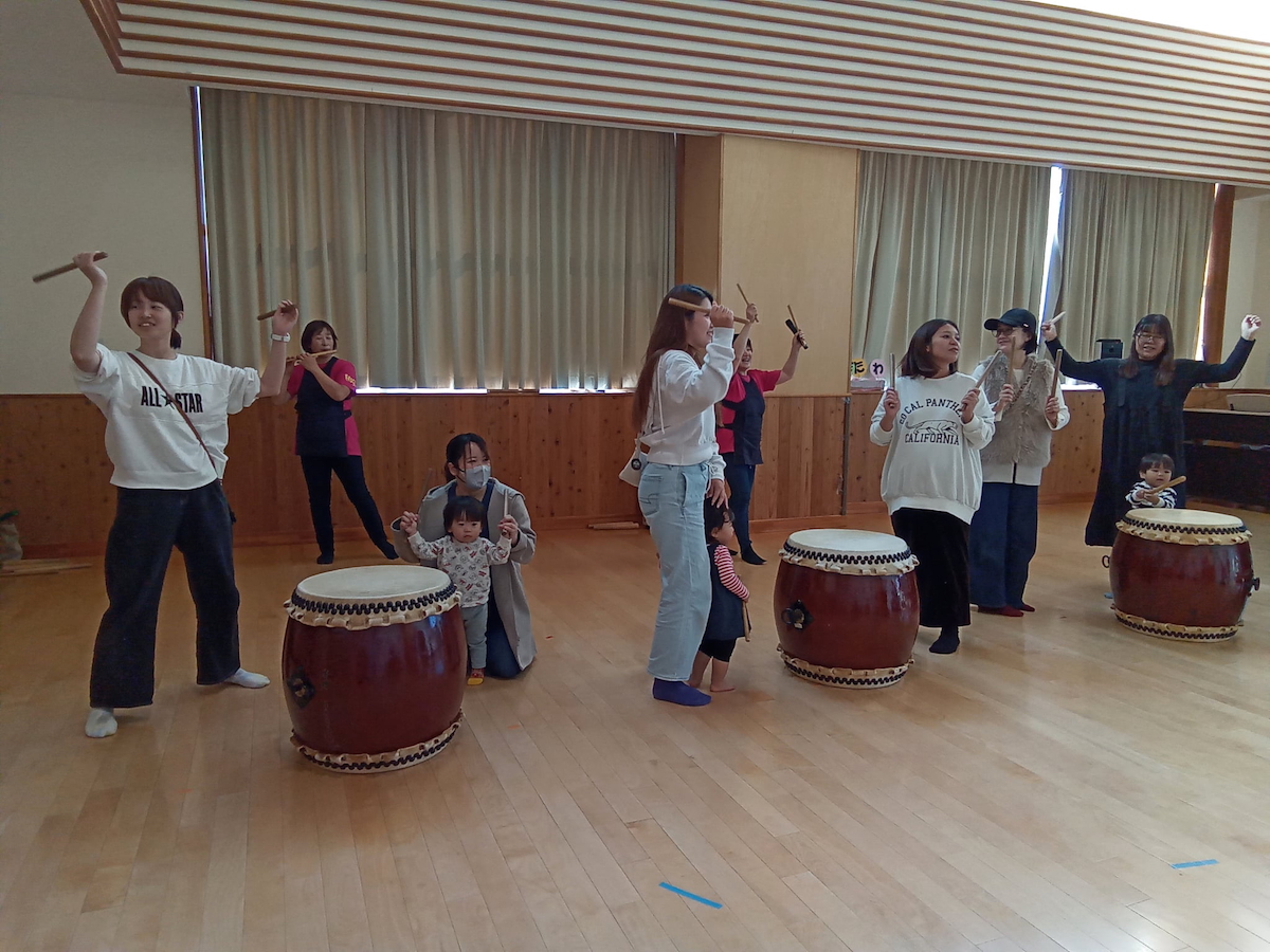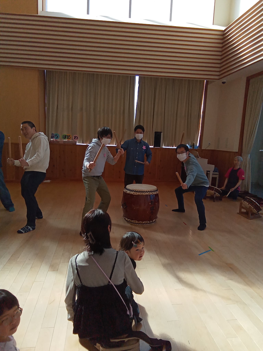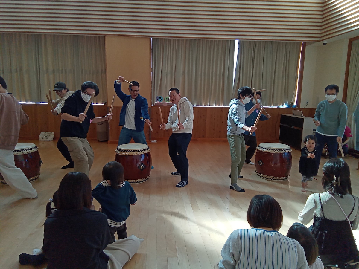 また、体験ではグループ毎にわかれて「すっ トントン」のリズムに合わせて太鼓をたたき、他の方が叩いている間も、踊りながら盛り上げパフォーマンスをしてくれたパパたちでした。ママたちもちょっぴり恥ずかしそうにしながらも太鼓の前に立つと堂々とした姿でたたいていました。