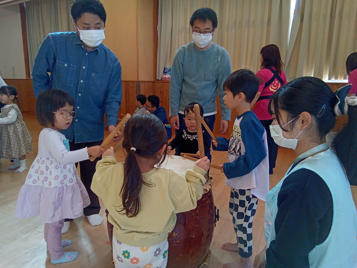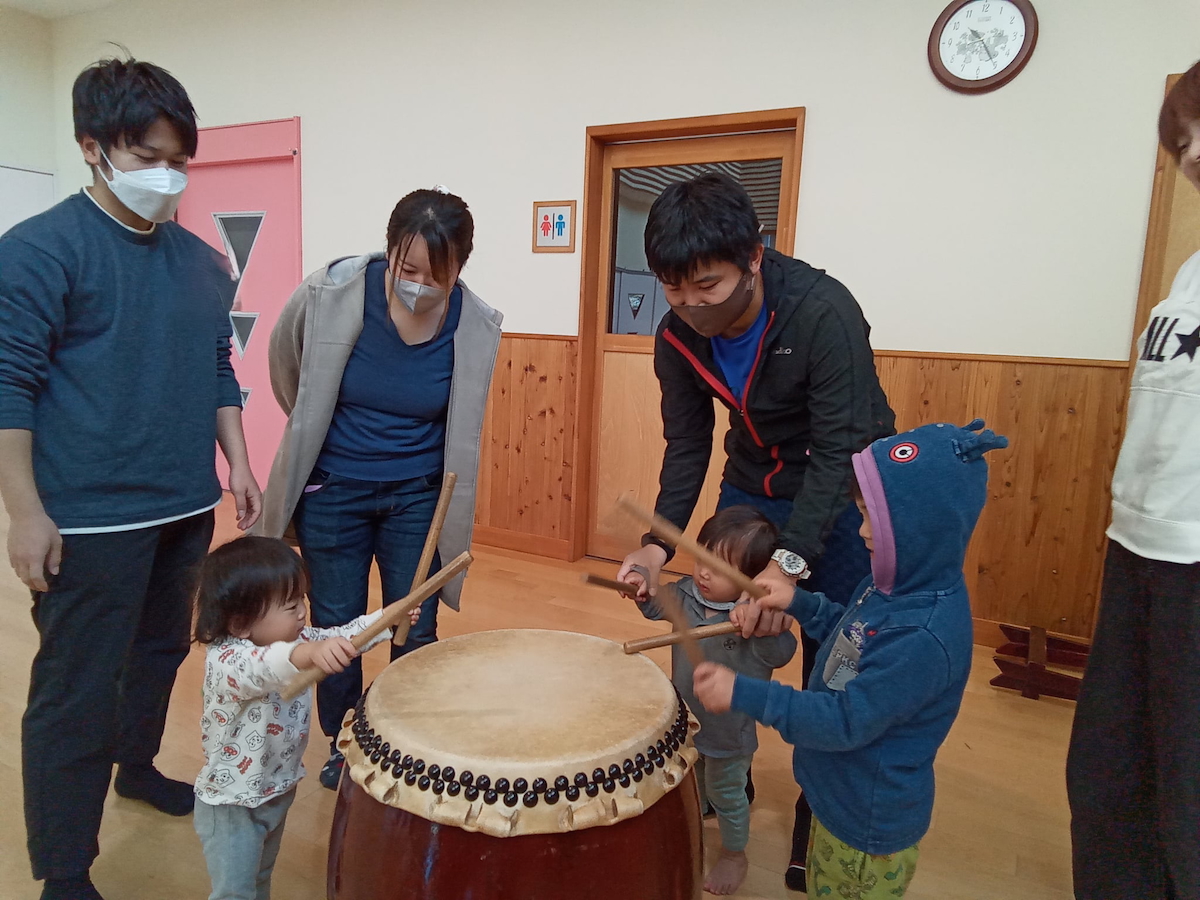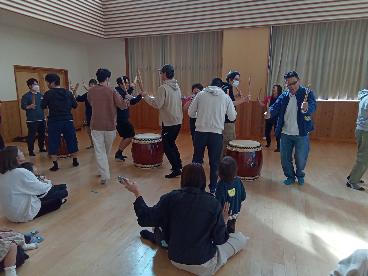 また、体験ではグループ毎にわかれて「すっ トントン」のリズムに合わせて太鼓をたたき、他の方が叩いている間も、踊りながら盛り上げパフォーマンスをしてくれたパパたちでした。ママたちもちょっぴり恥ずかしそうにしながらも太鼓の前に立つと堂々とした姿でたたいていました。